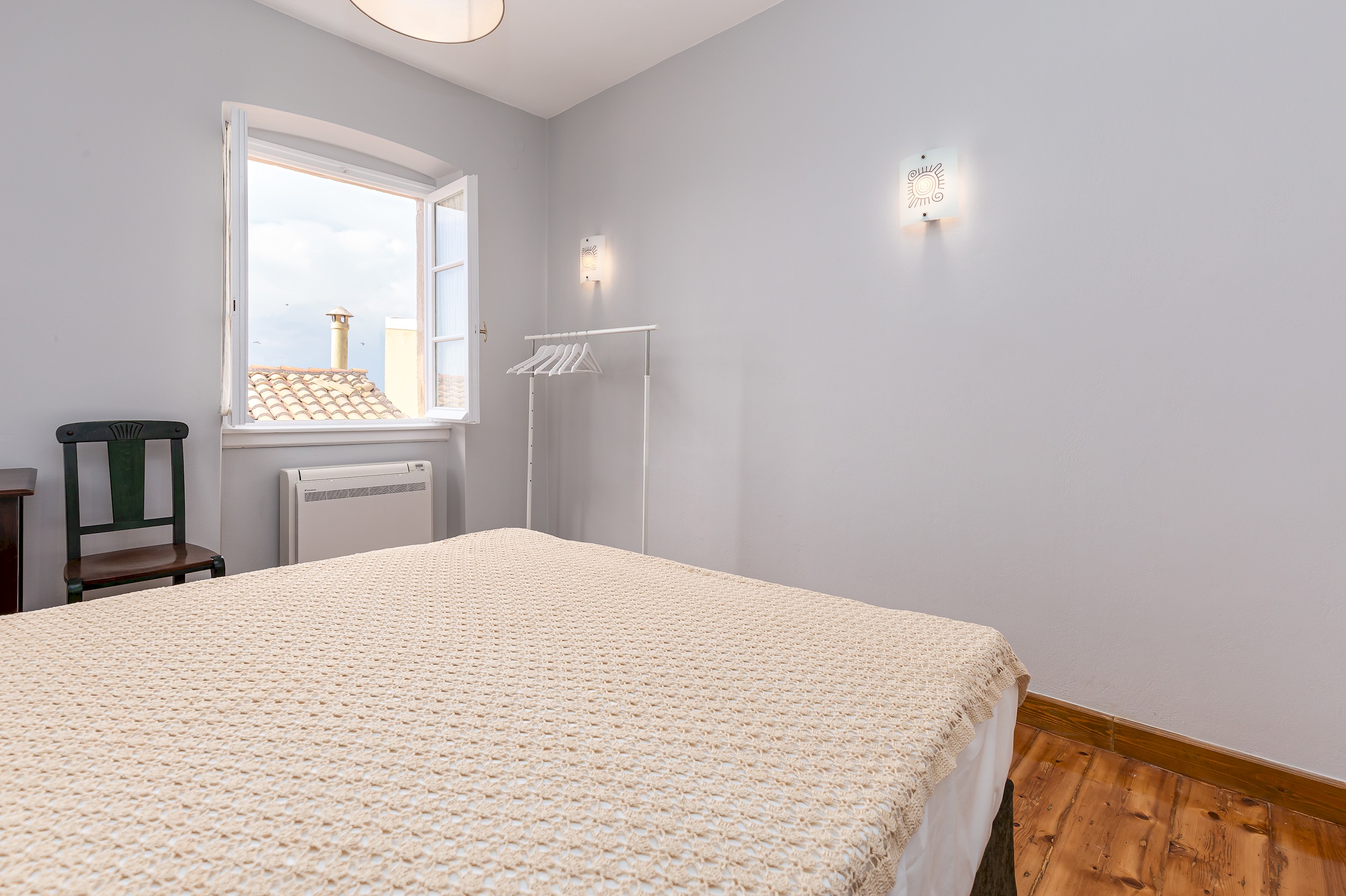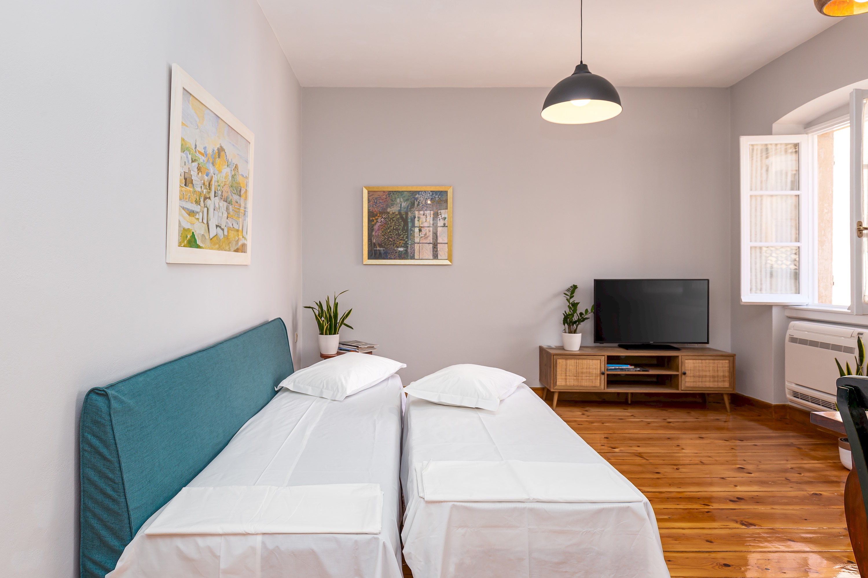 The spacious master bedroom features a Queen size bed! The room is equipped with individual A/C, and hangers. You can enjoy a fresh morning breeze from the room's balcony overlooking Corfu town roof tiles and sea.