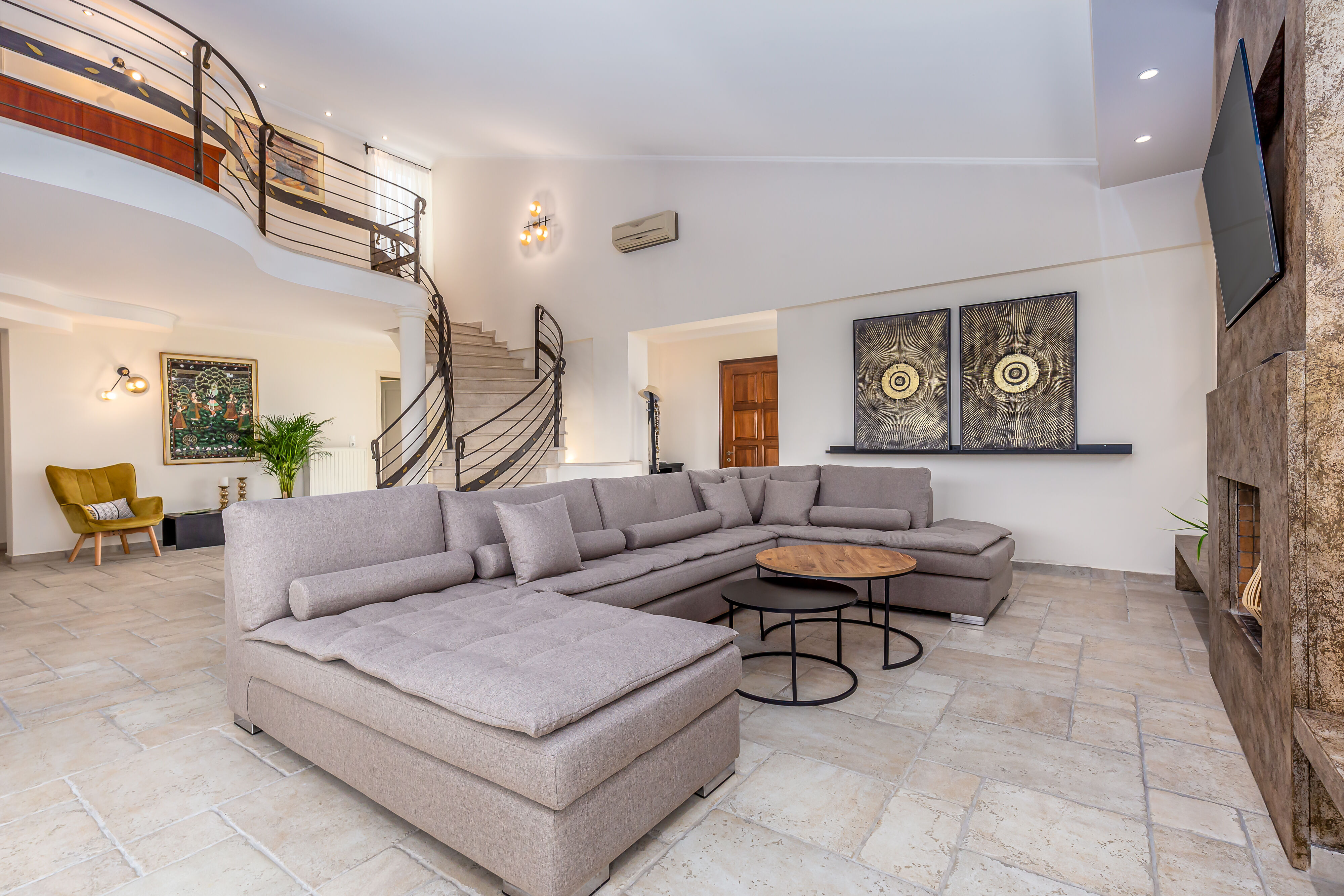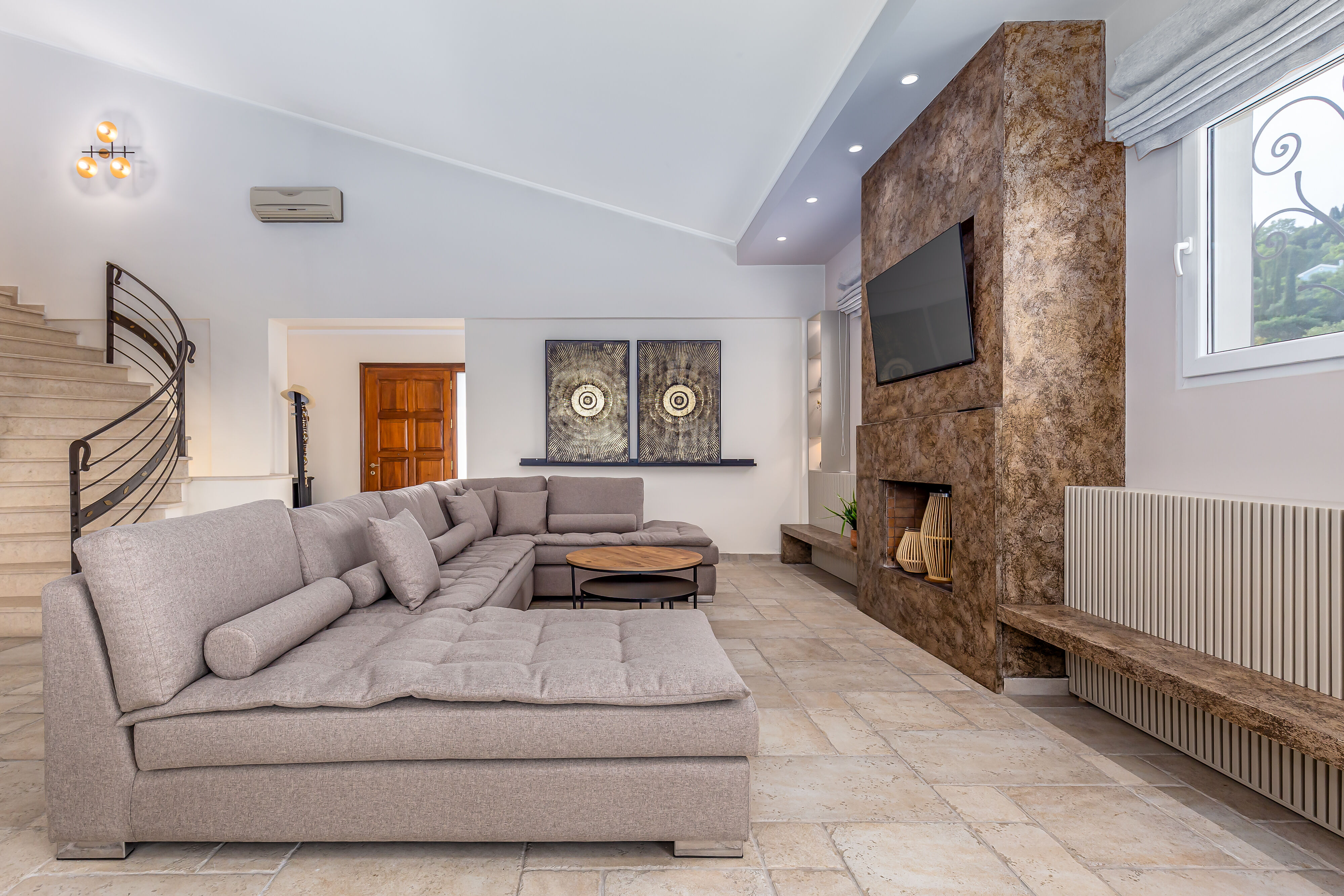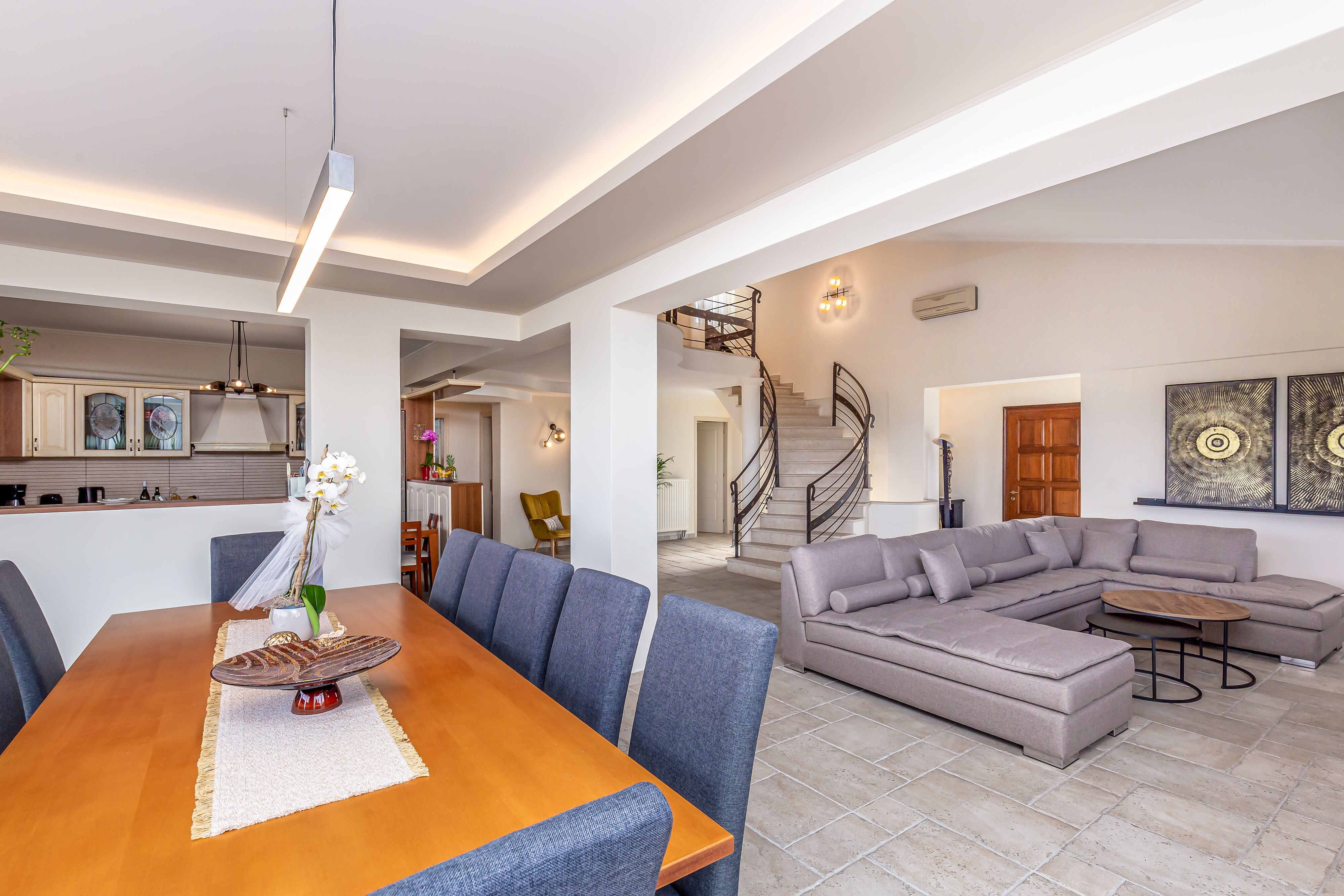 As you step into Villa Crystal, you'll be greeted by a spacious and elegantly designed living room area, exuding a warm and inviting ambiance. Sink into the plush sofas and unwind while enjoying the company of your loved ones or watching your favorite shows on the large flat-screen TV.