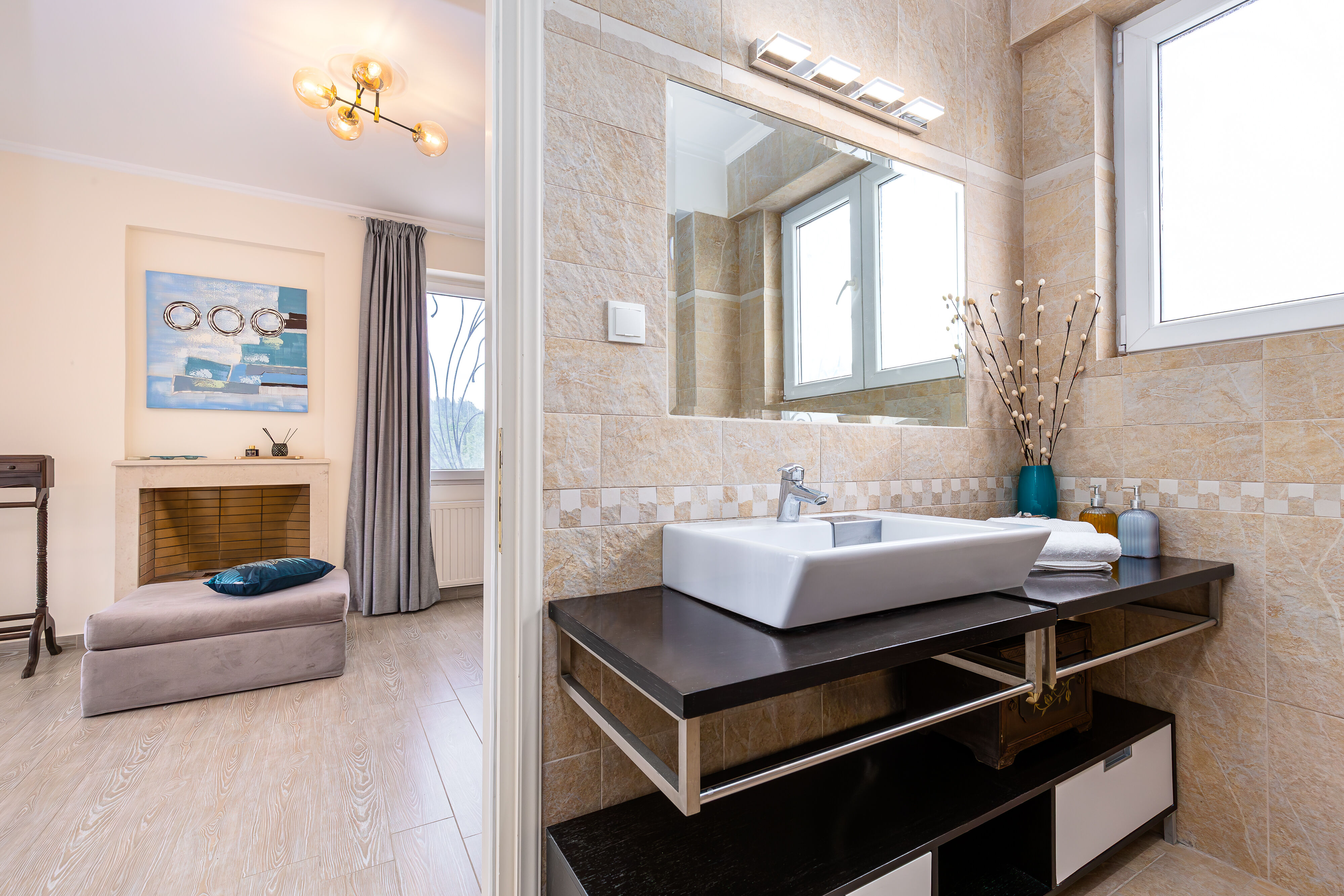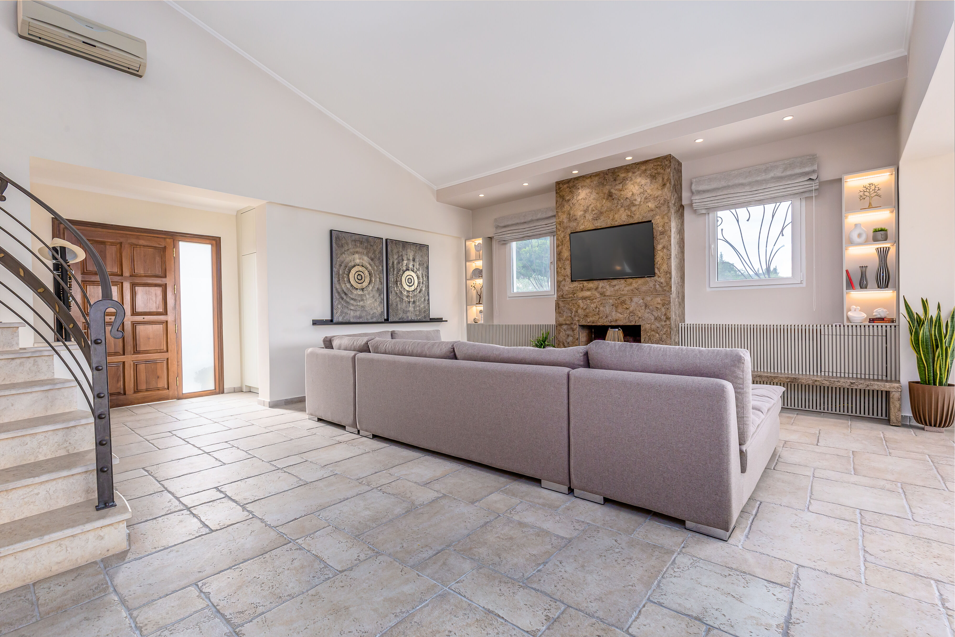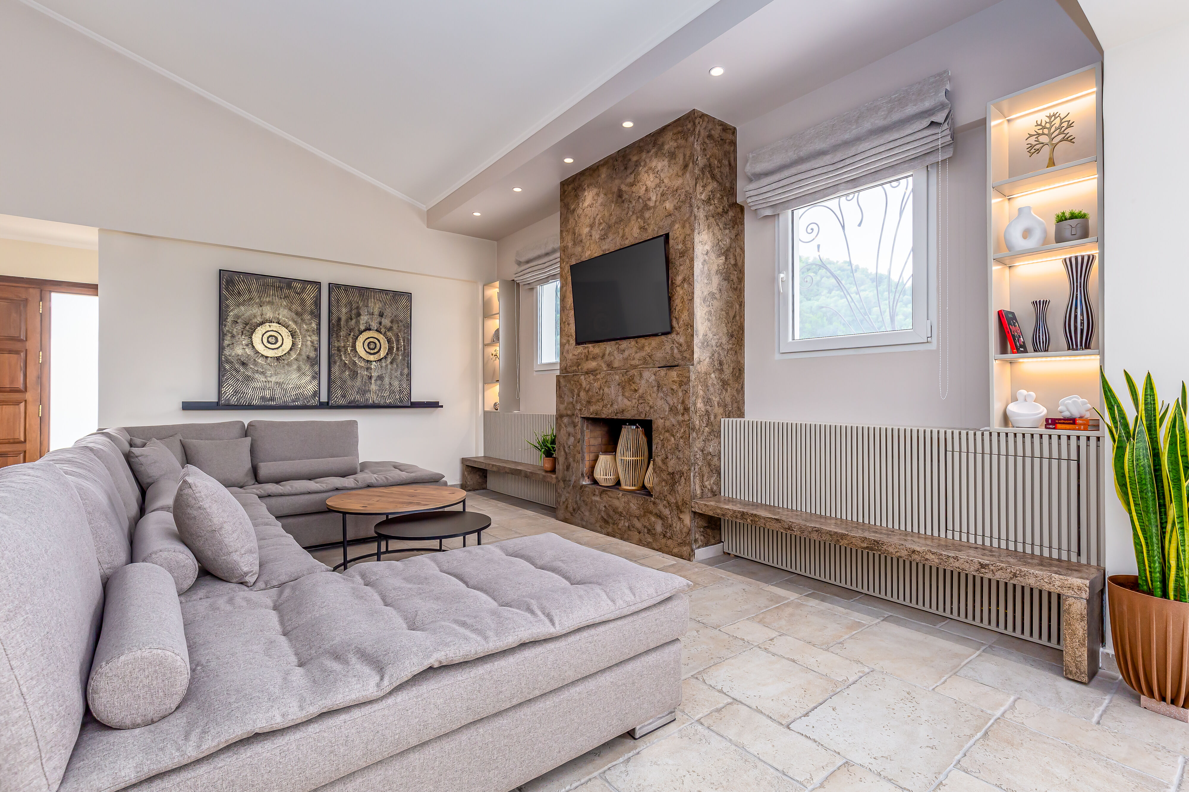 As you step into Villa Crystal, you'll be greeted by a spacious and elegantly designed living room area, exuding a warm and inviting ambiance. Sink into the plush sofas and unwind while enjoying the company of your loved ones or watching your favorite shows on the large flat-screen TV.