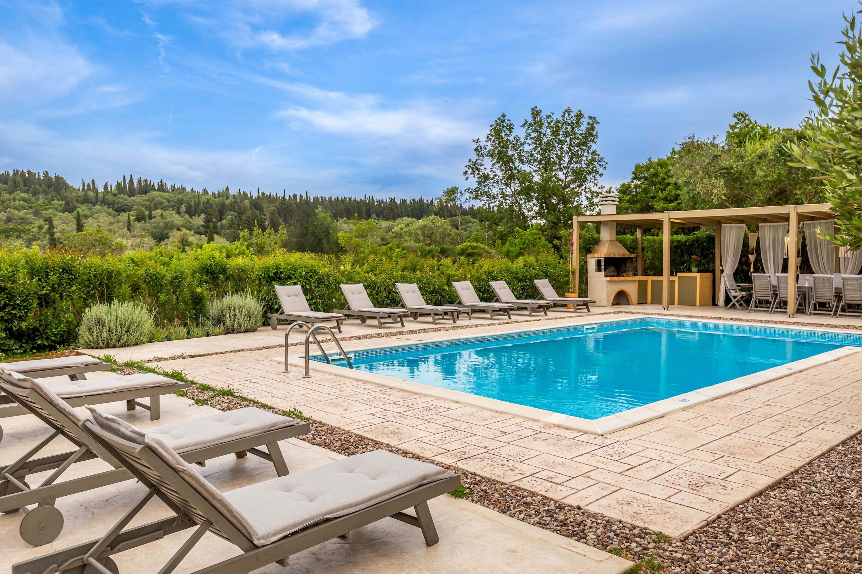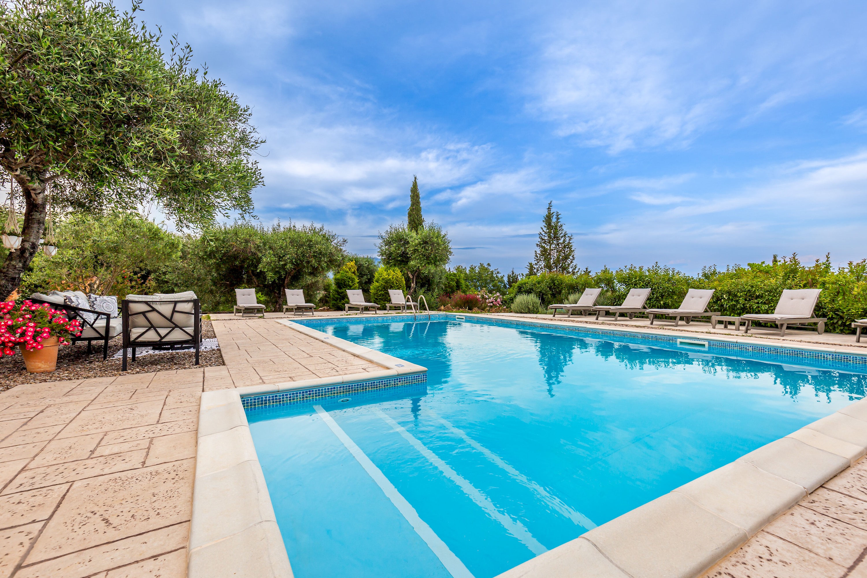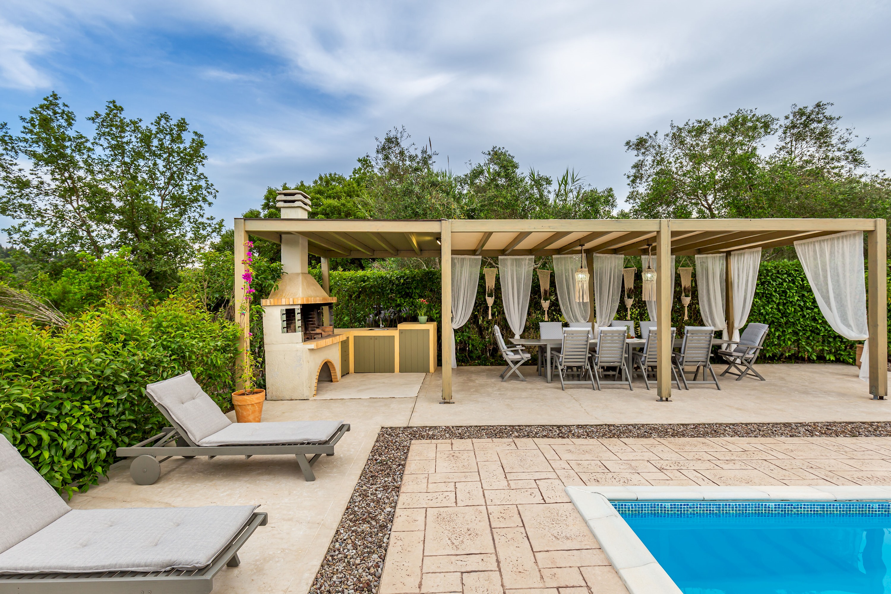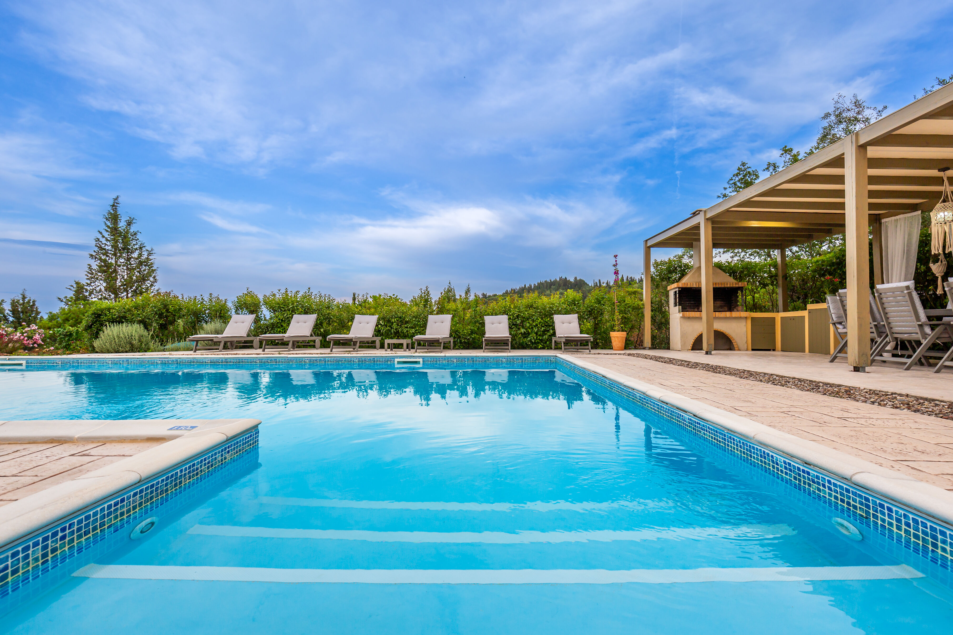 Outside, the villa showcases a large, meticulously landscaped garden, creating a tranquil oasis for outdoor activities and relaxation. Take a dip in the sparkling pool, soak up the sun on the comfortable loungers, or unwind in the shaded area, complete with a BBQ and a spacious table for ten. Whether it's a leisurely breakfast, a delightful al fresco lunch, or a memorable dinner under the stars, this outdoor space is perfect for enjoying the Mediterranean climate.