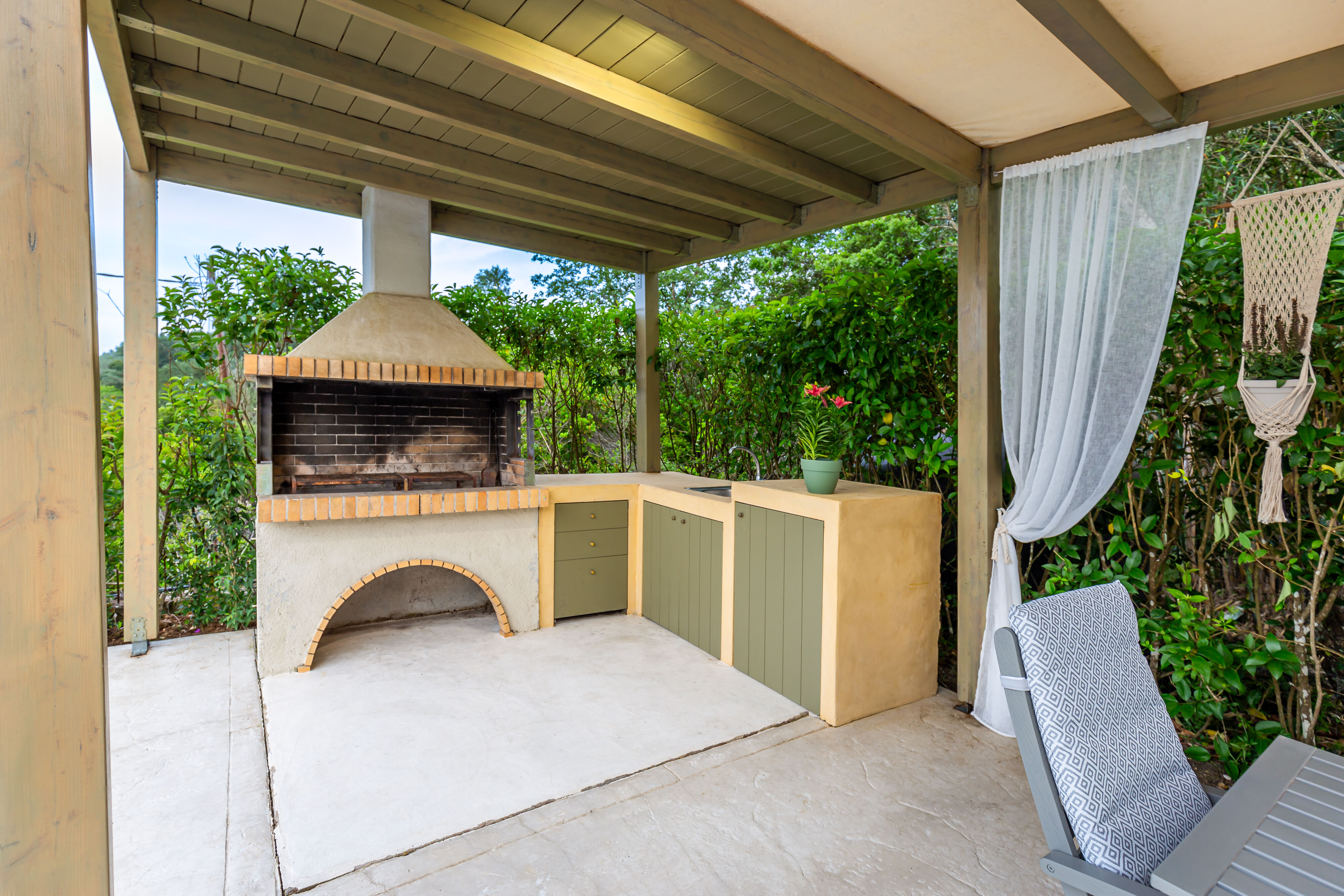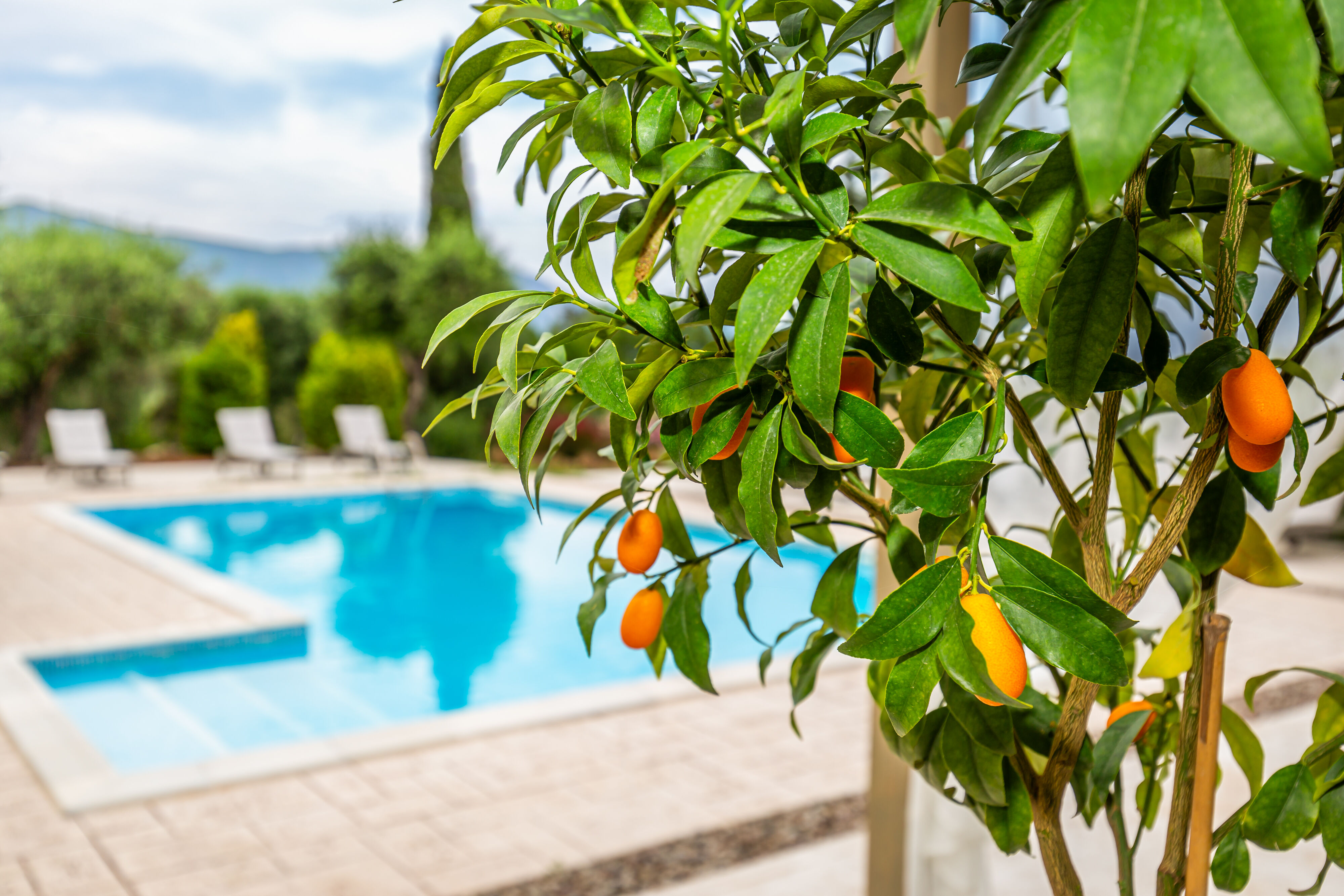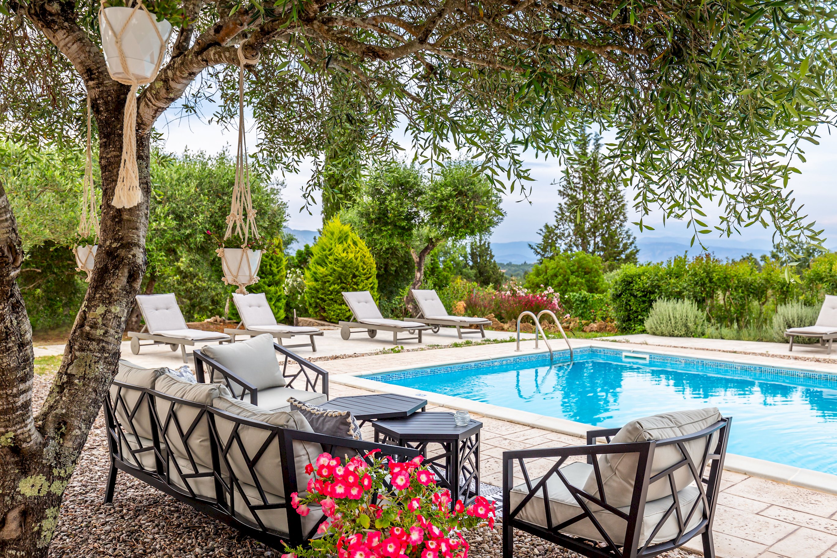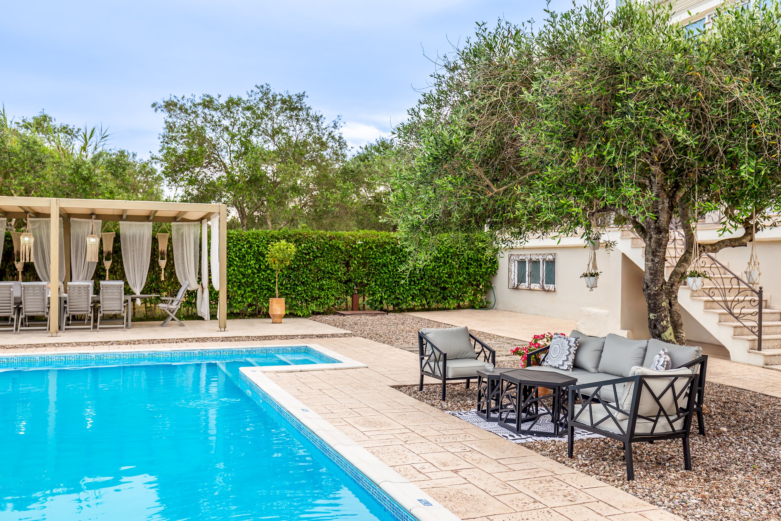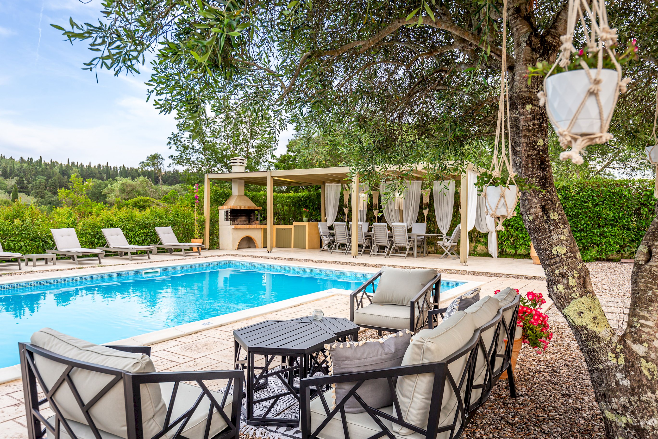 Outside, the villa showcases a large, meticulously landscaped garden, creating a tranquil oasis for outdoor activities and relaxation. Take a dip in the sparkling pool, soak up the sun on the comfortable loungers, or unwind in the shaded area, complete with a BBQ and a spacious table for ten. Whether it's a leisurely breakfast, a delightful al fresco lunch, or a memorable dinner under the stars, this outdoor space is perfect for enjoying the Mediterranean climate.