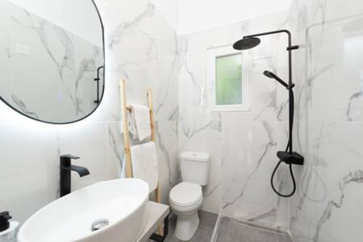 The house features two well-appointed bedrooms. The master bedroom boasts a comfortable double bed, while the second bedroom is equipped with two single beds, providing a cozy space for a restful night's sleep. The spacious living room includes a double sofa bed, perfect for accommodating additional guests. For the seventh guest, there is a foldable bed available, ensuring everyone has a comfortable place to rest. There is a modern shower room, clean and equipped with all necessary amenities for your stay.